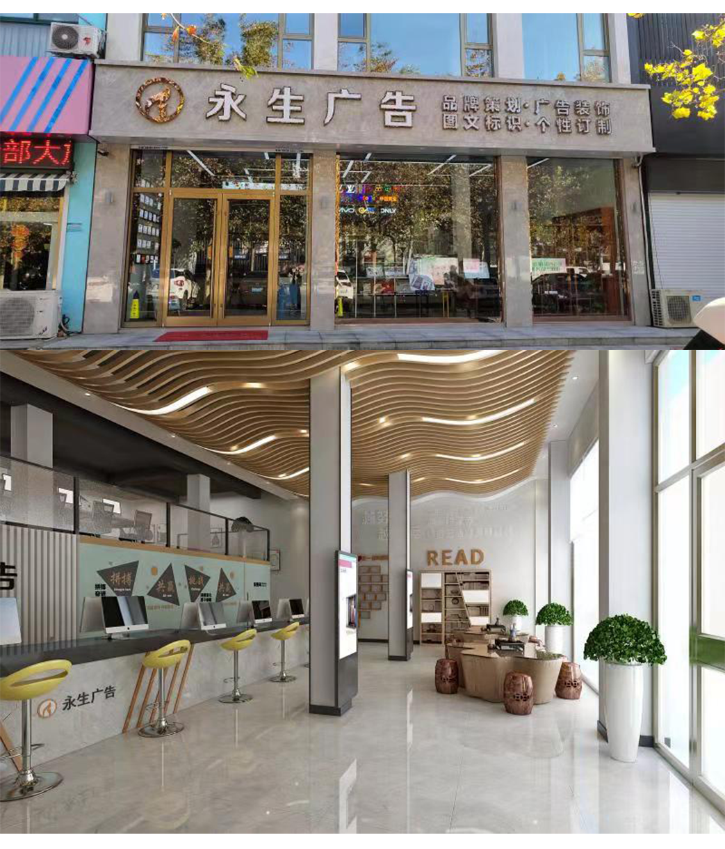 公司自有數(shù)碼沖床設(shè)備、500W光纖機(jī)、高精度大幅面噴繪機(jī)、寫(xiě)真機(jī)、UV機(jī)、多種大小型雕刻機(jī)、吸塑機(jī)、全自動(dòng)圍字機(jī)、自動(dòng)開(kāi)槽機(jī)、激光焊接機(jī)、拋光機(jī)等生產(chǎn)加工設(shè)備,擁有完善的設(shè)計(jì)團(tuán)隊(duì)、技術(shù)團(tuán)隊(duì)、施工團(tuán)隊(duì)、售后團(tuán)隊(duì),可為廣大客戶(hù)提供室內(nèi)裝修、店招門(mén)頭、精神堡壘、黨建標(biāo)識(shí)、標(biāo)識(shí)標(biāo)牌、宣傳欄、LED顯示屏、警示標(biāo)識(shí)、精品字、證卡胸牌、證書(shū)獎(jiǎng)杯、燈箱、桌牌、定制禮品、展具、噴印等多種專(zhuān)業(yè)廣告服務(wù)...